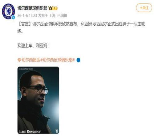 1月6日,据足球报:英超切尔西足球俱乐部官方消息,英格兰少帅罗西尼尔成为切尔西新帅。